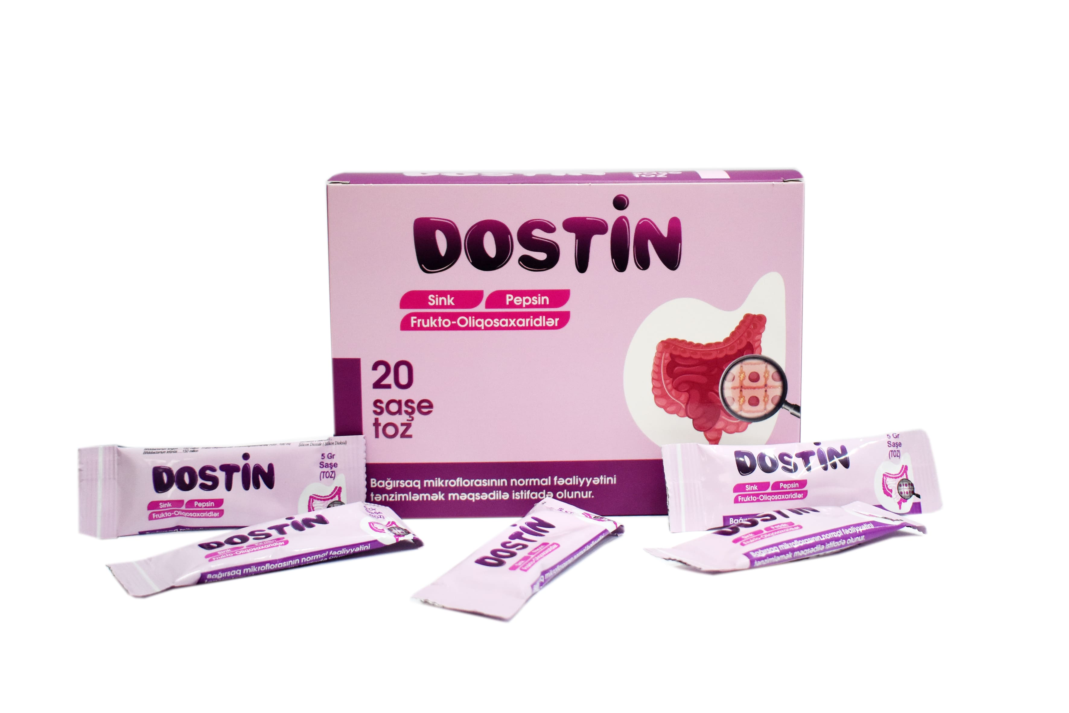 Xüsusiyyətləri: Dostin bağırsaq mikroflorasına normallaşdırıcı təsir göstərir, bağırsaq mikroflorasının tarazlığını tənzimləyir və onların fizioloji funksiyalarının yerinə yetirilməsini təmin edir. Dotinin terapevtik effekti canlı bakteriyaların hesabına əldə olunur. Dostinin tərkibindəki süd turşusu bakteriyaları süd turşusunun əmələ gəlməsini sürətləndirir. Bağırsaqlarda turş mühitin formalaşması patogen və şərti-patogen mikroorqanizmlərin inkişafı üçün əlverişsiz mühitin yaranmasına səbəb olur. Süd turşusu bakteriyaları monosaxaridlərin mənimsənilməsində və öd turşularının metobolizmində iştirak edir, bağırsaqların epiteli hüceyrələrinin membranlarını stabilləşdirməklə elektrolitlərin və vitaminlərin (Vitamin B1, B2, B6, B12, K, E, PP, C, D, biotin, dəmir, kalsium) sorulmasını sürətləndirir.